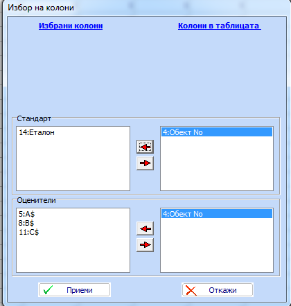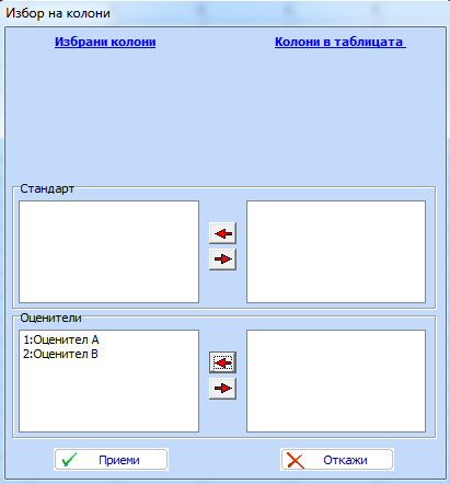 Появява се таблица, в която трябва да се посочи броя на оценките за всеки оценител. След кликване на бутона “Приеми“ се получават същите резултати, както и при първия начин на подреждане.