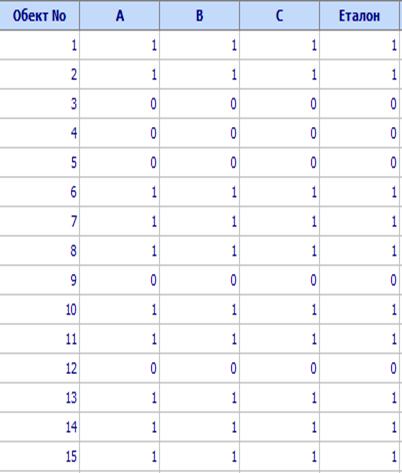 Трима оценители A,B и C оценяват 50 детайла, като ги отнасят към една от категориите Годно (1) или Негодно (0). Всеки извършва оценяването по 3 пъти без да знае, че това са едни и същи детайли. За тези 50 детайла се знае и истинското им състояние, което е означено като „Еталон“ (не е задължително да се задава „Еталон“). Фрагмент от данните е показан по-долу: