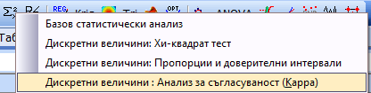 За да проведем анализа извикваме опцията „Дискретни величини: Анализ на съгласуваност (Kappa)“, Избираме двете колони: