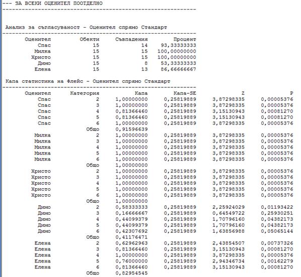 Най-добро съвпадение със стандарта показват оценките на Милка и Христо (100 %), следва Спас (93.3 %), Елена (86.7 %), Димо (53.3 %). Съвпадението на оценките на Милка и Христо е отлично (Kaпa =1), на Спас – между отлично и много добро (Kaпa = 0,916), на Елена е добро (Kaпa = 0.83), a на Димо не е добро (Kaпa=0.41).