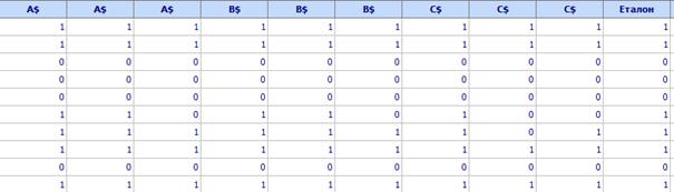 Пример. Трима оценители A,B и C оценяват 50 детайла, като ги отнасят към една от категориите Годно (1) или Негодно (0). Всеки извършва оценяването по 3 пъти без да знае, че това са едни и същи детайли. За тези 50 детайла се знае и истинското им състояние, което е означено като „Еталон“ (не е задължително да се задава „Еталон“). Фрагмент от таблицата с данните е показан по-долу: