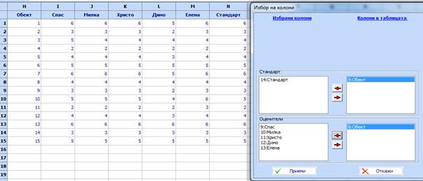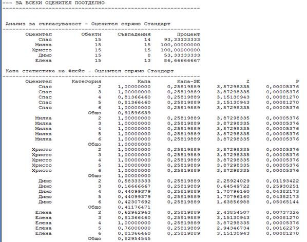 Най-добро съвпадение със стандарта показват оценките на Милка и Христо (100 %), следва Спас (93.3 %), Елена (86.7 %), Димо (53.3 %). Съвпадението на оценките на Милка и Христо е отлично (Kaпa =1), на Спас – между отлично и много добро (Kaпa = 0,916), на Елена е добро (Kaпa = 0.83), a на Димо не е добро (Kaпa=0.41).