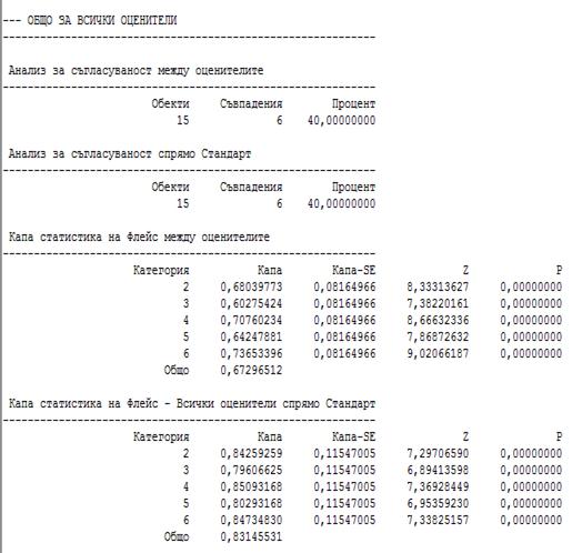 Съгласуваността на оценките за всички оценители помежду им не е добра (Kaпa = 0.673). Най-голями различия има при оценката 3 (за нея Kaпa = 0.603). Общото съвпадение на всички оценки със стандарта е добро (Kaпa = 0.83).