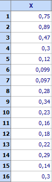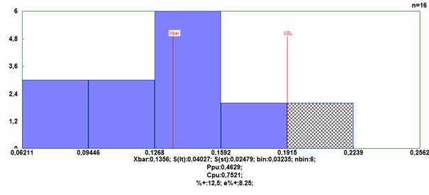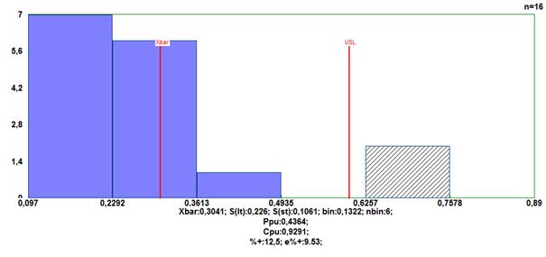 За да се активират програмите трябва да е набрана колона с данни. Например,нека са зададени N = 16 наблюдения, за които е зададена и горна толерансна граница USL = 0,6. Хистограмата е (данните се намират във файл BoxCox-Normality.qsl в директоря Primeri в директорията, в която е инсталирана програмата):