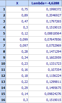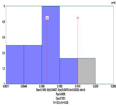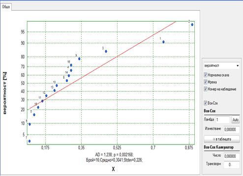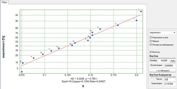 Вижда се, че оптималното λ = -4,6288, а за трансформираните данни критерият на Андерсън-Дарлинг показва р = 0,7851. Поради това трансформираното разпределение може да се смята за нормално. Горната толерансна граница след трансформацията със същата стойност за λ става USL (λ=-4,6288) = 0,191509.