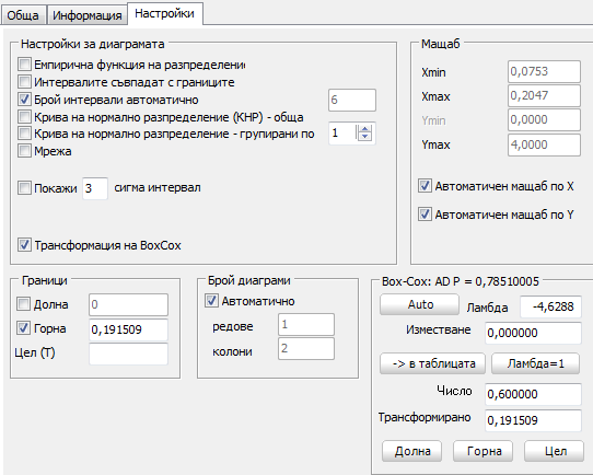 Същата трансформация може да се направи и ако се извика програмата за хистограми. Тогава се маркира „Трансформация на Box-Cox и след това „Auto”. Може също да се нанесе граничната стойност (в примера USL = 0,6) в графата „Число“ и се появява трансформираната стойност в графата „Трансформирано“. То може да се премести в полето за долна или горна толерансна граница чрез бутоните „Горна“ или „Долна“: