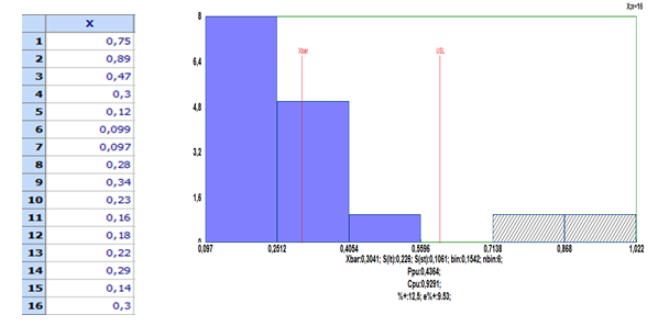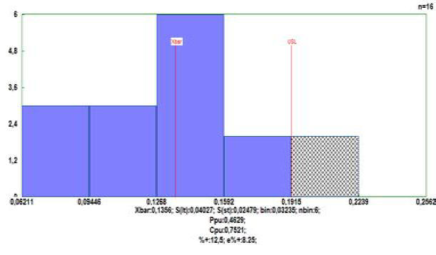 Например,нека са зададени N = 16 наблюдения, за които е зададена и горна толерансна граница USL = 0,6. Хистограмата е: