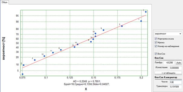 Вижда се оптималното λ = -4,6288, а за трансформираните данни критерият на Андерсън-Дарлинг показва р = 0,7851. Поради това трансформираното разпределение може да се смята за нормално. Горната толерансна граница след трансформацията със същата стойност за λ става USL (λ=-4,6288) = 0,191509. Хистограмата, начертана по трансформираните данни е: