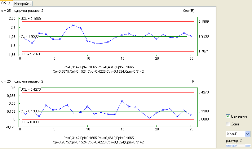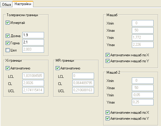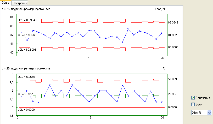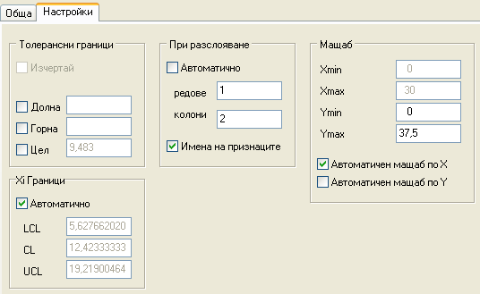 За да се провери какво е поведението на един процес при наличието на групирани данни може да се чертае както контролна, така и толерансна карта. По-долу са дадени Xbar-R и толерансна карта за 'съпротивление-1' от файла 5-Control charts-variables.qsl. Данните са групирани по 2 в подгрупа. Дадени са и настройките за Xbar-R картата.