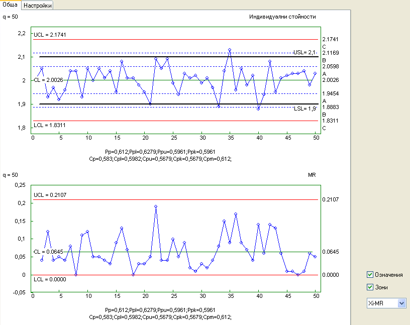Данните за следващите графики са в 5-Control charts-variables.qsl, който е даден в директорията с примерите. Една карта може да се построи като се използва само една колона с данни, например колоната "съпротивление". За начертаване на Xi-MR картата използвайте Диаграми и методи/Контролна карта - количествени признаци. На Xi-картата са нанесени зони, всяка от които е с ширина едно средноквадратично отклонение (общо са 6 СКО), както и толерансните граници LSL и USL. За целта се правят следните настройки: