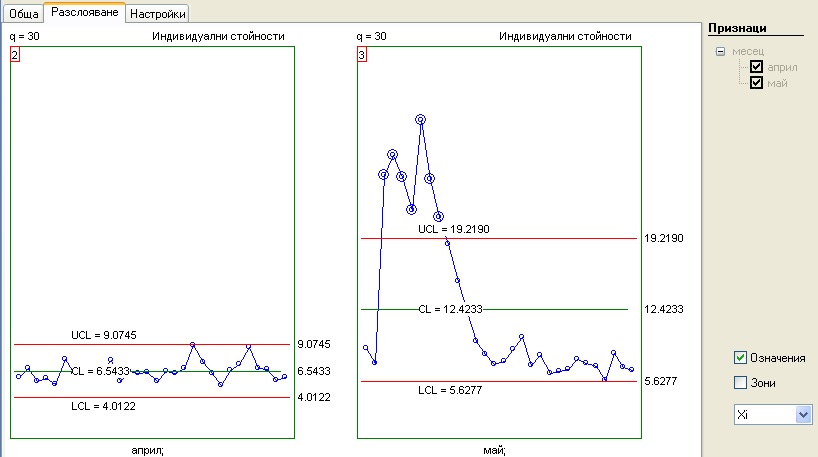 Получена е следната разслоена контролна карта, която показва, че в началото на месец май е имало силно замръсяване на водите на реката: