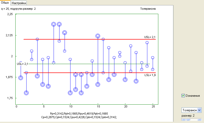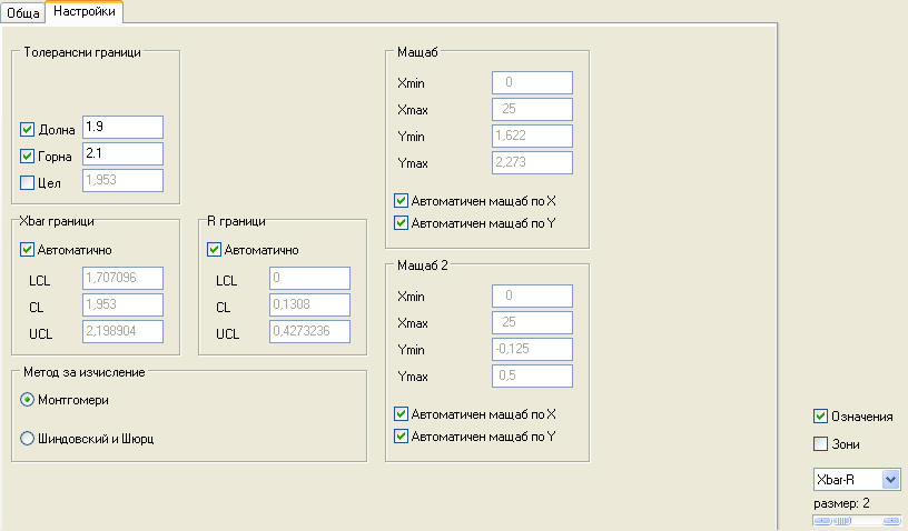 Размерът на извадката за изчисляване на статистиките може да бъде вариран или определен на подгрупи. Толерансни граници могат да се чертаят единствено на картите по индивидуални стойности и толерансните карти, тъй като при картите с групирани данни се получава неправилна интерпретация за нарушенията на толерансите. Ако са зададени толерансни граници за всички карти се изчисляват индексите на възможностите на процеса и индексите на характеристиките на процеса.