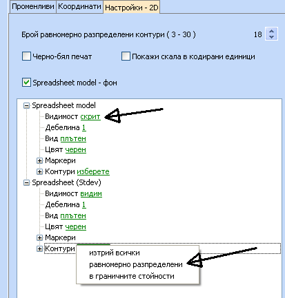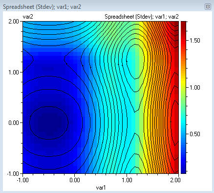 1. Най-напред ще начертаем функцията и нейното стандартно отклонение. Изберете 'Линии на постоянни стойности' и прехвърлете Spreadsheet model в секцията 'Модел' и Spreadsheet (Stdev) в секцията 'Ограничения'. Макар че на този етап не използваме ограничения, това ще ни помогне да наложим едно върху друго двата вида контури. Главна функция ще бъде Spreadsheet model.
