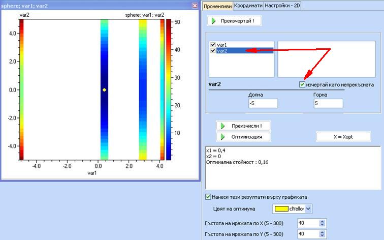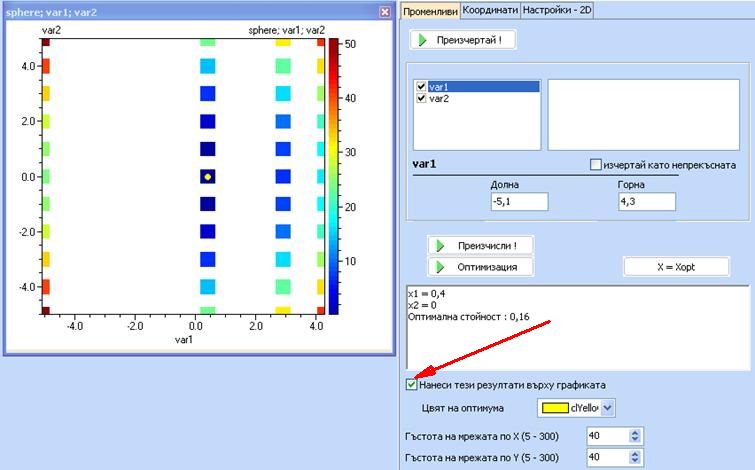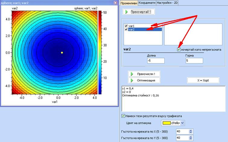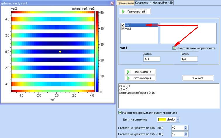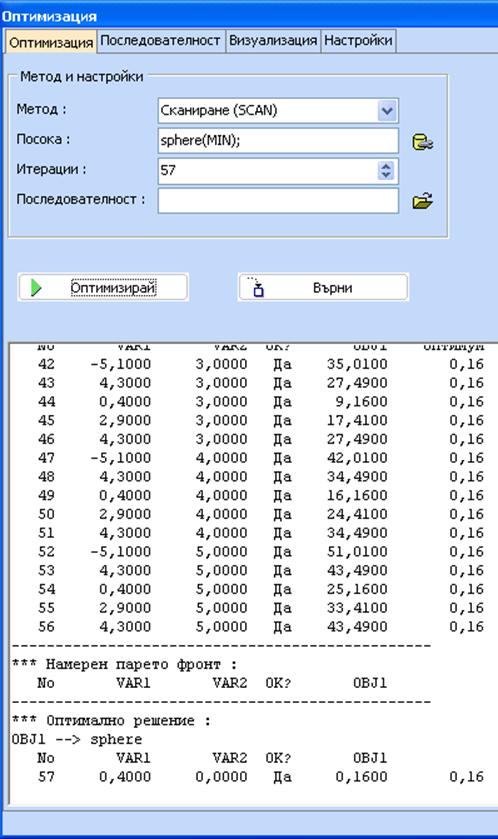 За да се извърши оптимизацията, използвайте бутона „Оптимизация”. Следващият пример илюстрира използването на метода „Сканиране (SCAN)”, който сканира по дискретните стойности и избира минимална стойност на целевата функция. Обърнете внимание, че независимо, че в непрекъснатото пространство оптимумът е 0 при var1=var2=0, в този пример с дискретни променливи минимумът е 0.16 при var1=0.4 и var2 = 0, което се дължи на факта, че var1 = 0 не е допустима дискретна стойност.