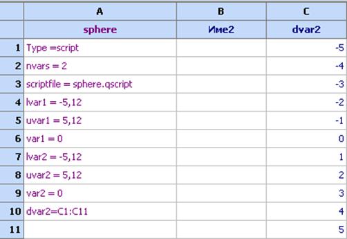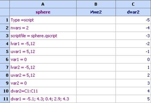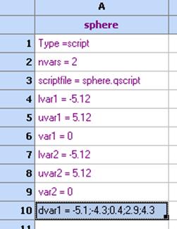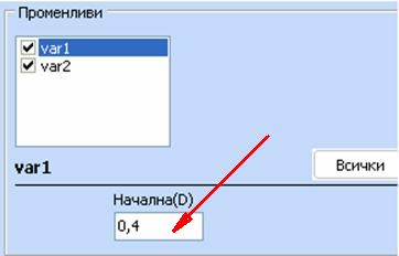 Сега да предположим, че първата променлива може да приема само следните стойности: -5.1; 4.3; 0.4; 2.9; 4.3. Можем да дефинираме това, като включим в колоната за дефиниране на модела следното dvar1 = -5.1; 4.3; 0.4; 2.9; 4.3: