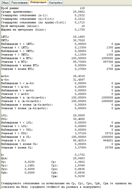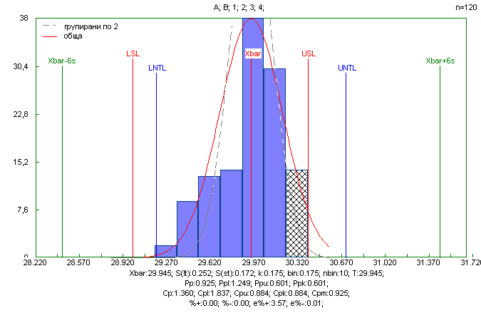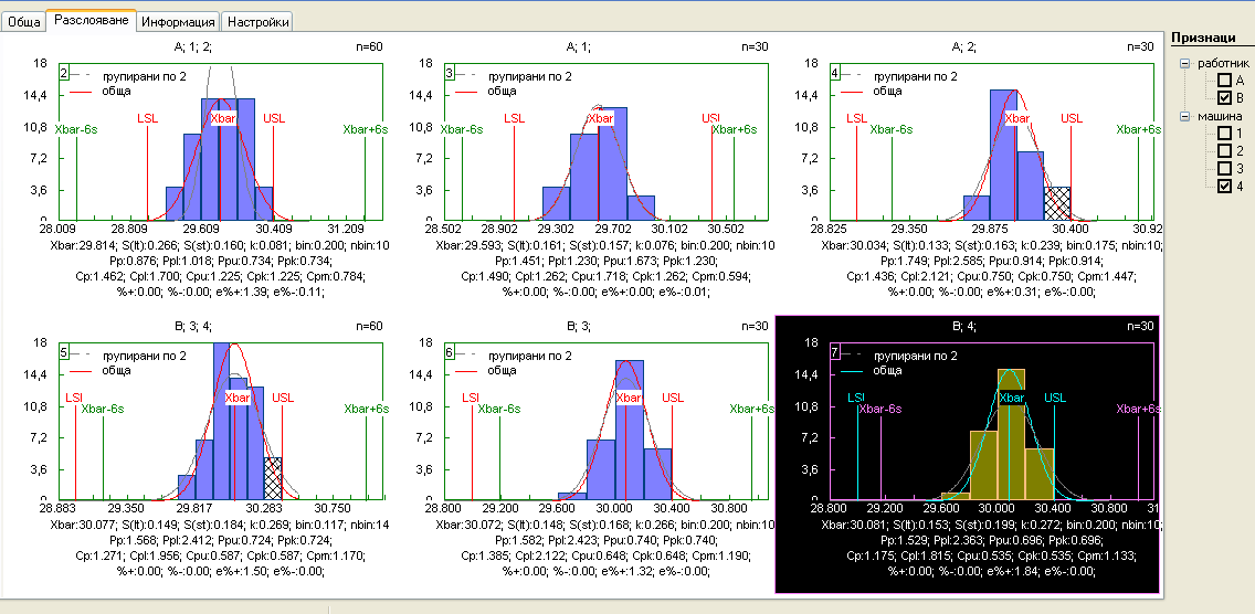 За да се видят примери за хистограми, отворете файла 3-Histograms.qsl от директорията с примерите. След това изберете "Диаграми и методи/Хистограми". За получаване на графиките по-долу са използвани данни "диаметър" и признаци "работник" и "машина"