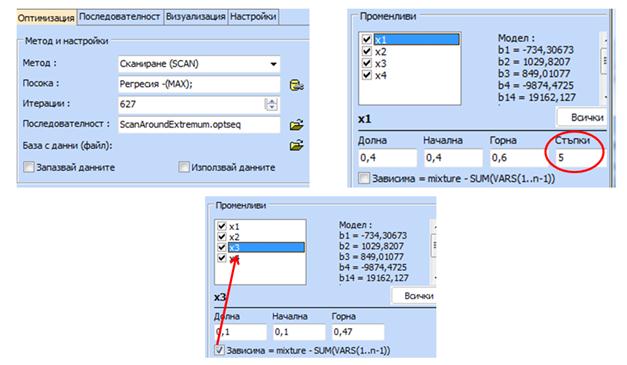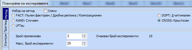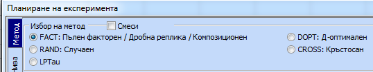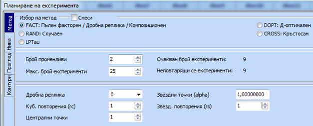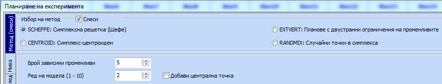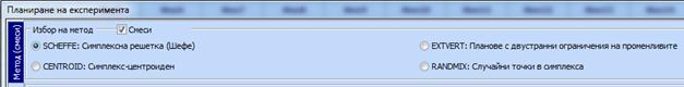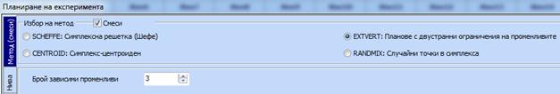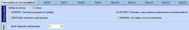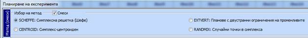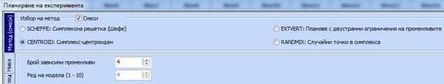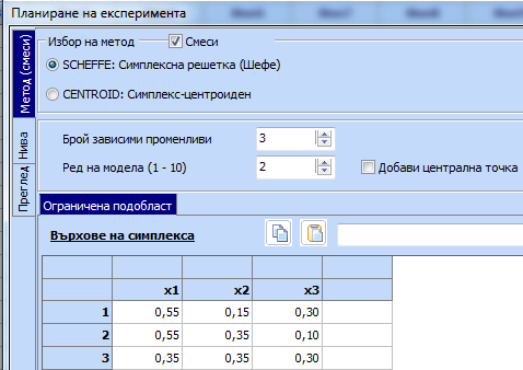 При избор на метод се маркира „SCHEFFE: Симплексна решетка (Шефе)“. Избира се брой зависими променливи и ред на модела. Възможни са следните съчетания (в таблицата е посочен броят на опитите за съответния план).