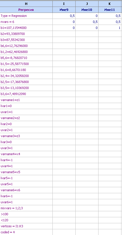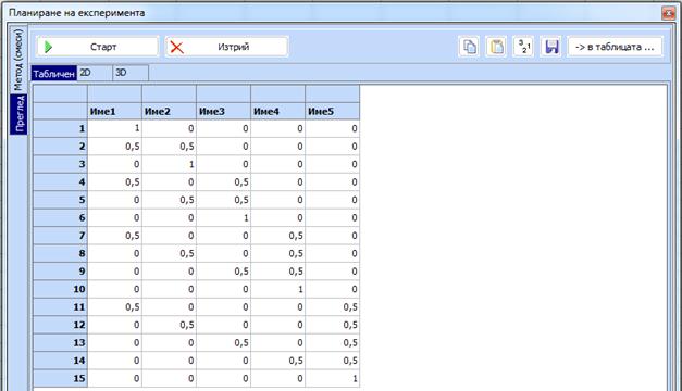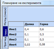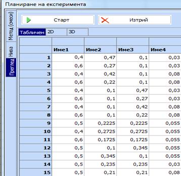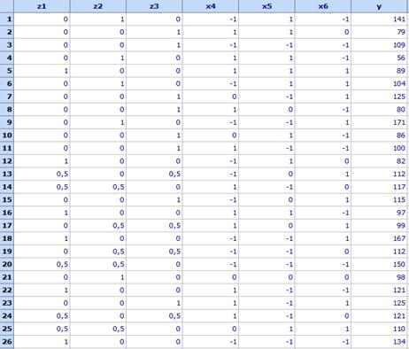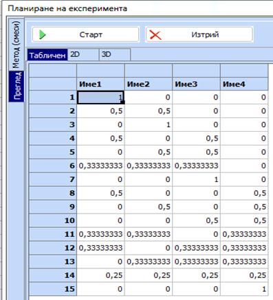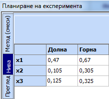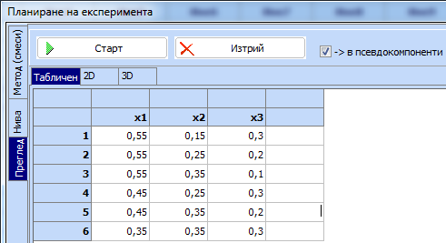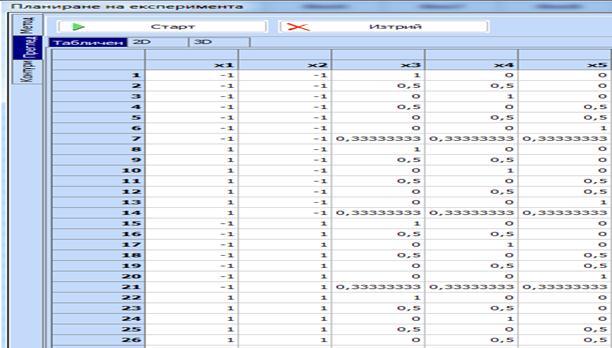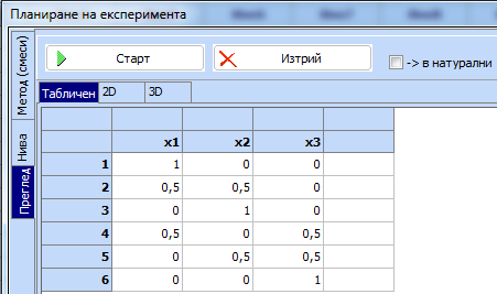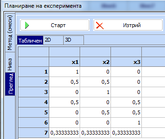 4. В случая кръстосването се състои в повтаряне на този план два пъти – един път при X4 = -1 и втори път – при Х4 = 1. Планът по смесевите променливи е рандомизиран, т.е. редовете в горната таблица са разместени по случаен начин. Така е получен следният план на експеримента (файл Mixtures-Beton.qsl - от директорията Primeri (намира се в директорията в която е инсталиран продуктът)):