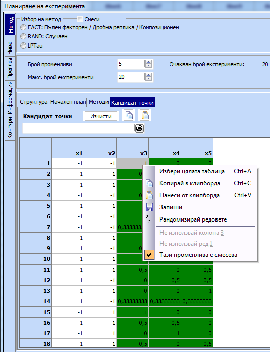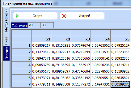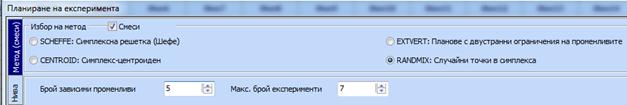 Генерирането на случайни точки става с процедурата RANDMIX: Случайни точки в симплекса. Нека например да имаме задача с 5 компоненти и да искаме да генерираме 7 случайни точки, които да използваме като контролни опити.