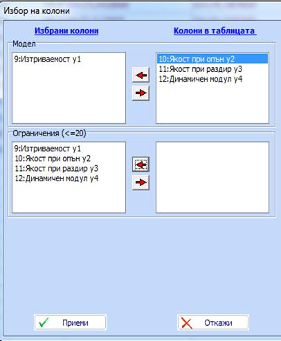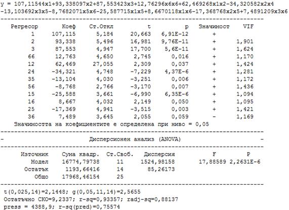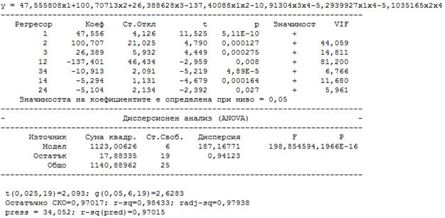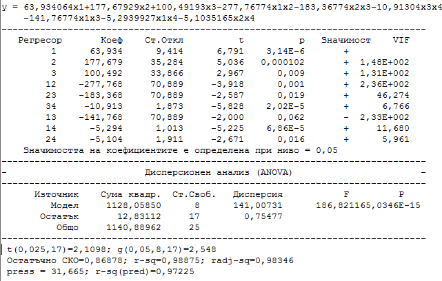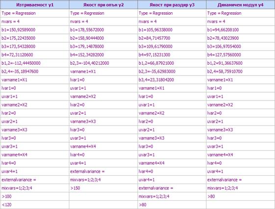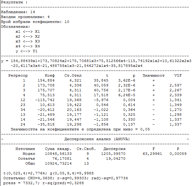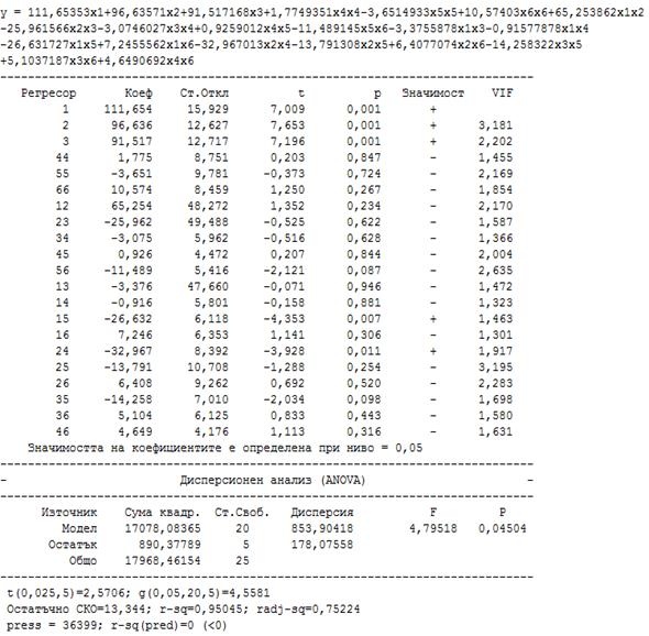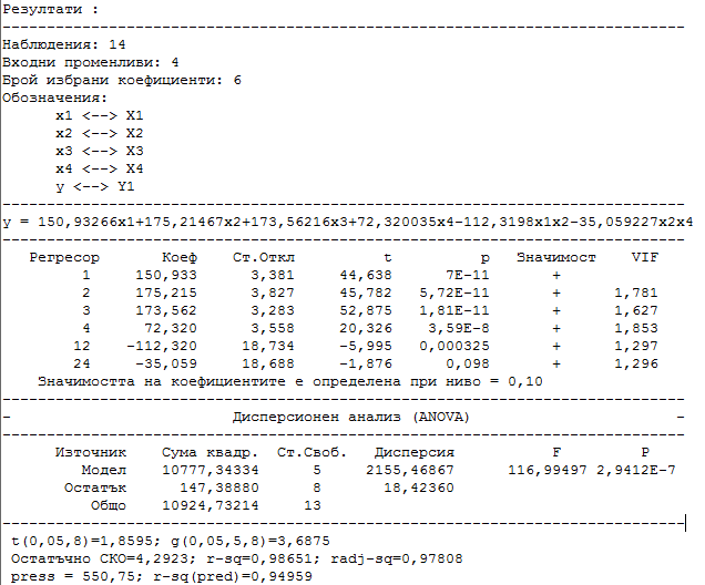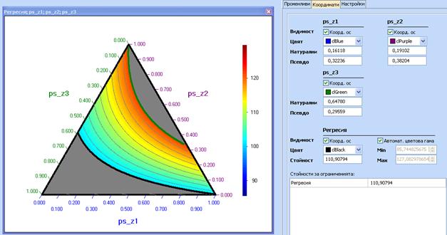 За построяване на модел с псевдокомпоненти е използван регресионен анализ, който за смеси има следните особености: