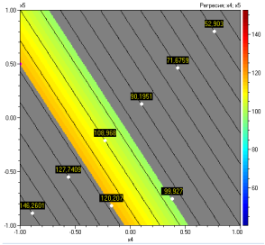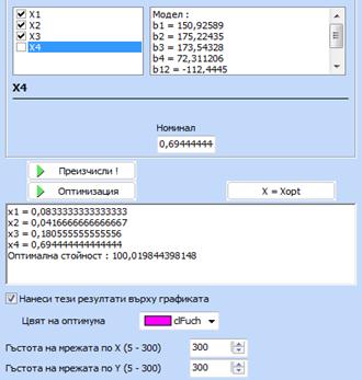 Ако се кликне бутона „Двумерна“ могат да се начертаят и двумерни диаграми по отношение на независимите променливи. Те ще бъдат построени при оптималните стойности на всички променливи, ако се кликне и бутона “X = Xopt”. Диаграмите са показани по-долу: