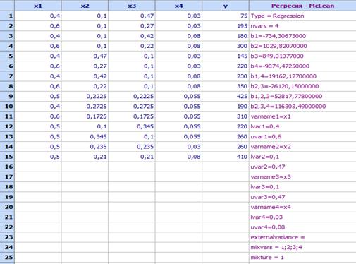 Линейно зависимите фактори са записани в колони A, B, C чрез псевдокомпоненти. Показателят „Модул при 300 %“ (у) е в колона G.