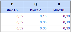 Върховете на ограничената подобласт са с координати: S1 (0,5; 0; 0,5), S2 (0; 0,5 , 0,5) и S3 (0; 0; 1). Затова за зависимите променливи са използвани псевдокомпоненти. Планът и резултатите от наблюденията са дадени във файл Mixtures-Process_variables.qsl от директорията Primeri (намира се в директорията в която е инсталиран продуктът) и са показани в следната таблица: