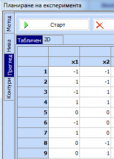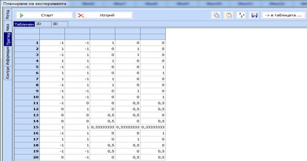 7. Кликва се „Преглед“, след това „Старт“ и се получава план с 20 точки, избрани измежду 63 кандидат-точки по критерия D-оптималност. Този план може да се прехвърли в основната таблица за използване, като се кликне бутона „в таблицата“