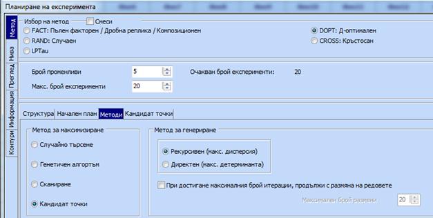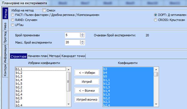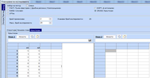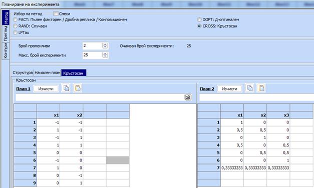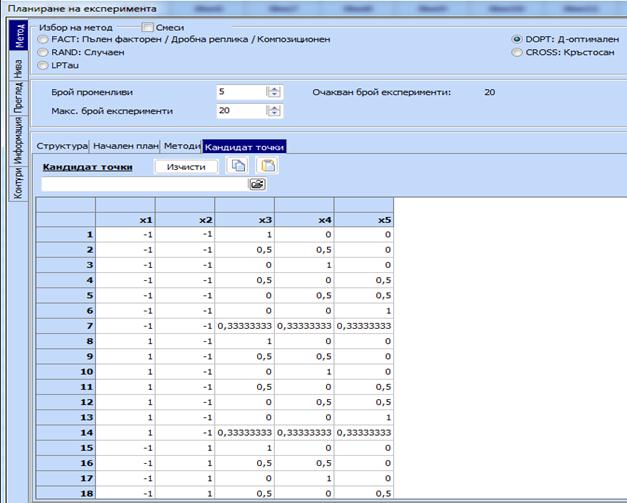 4. Кликва се бутона „Кандидат-точки“ и в отворилото се поле се нанася от клипборда предварително запомненият кръстосан план. Маркира се също надписа DOPT: Д-оптимален: