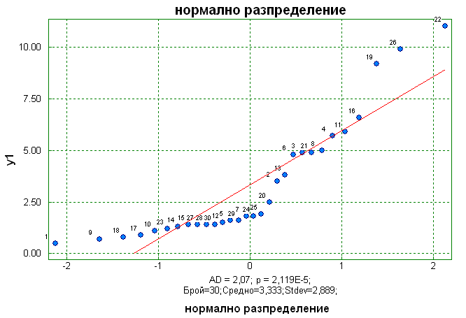 Много от статистическите методи се базират на предпоставката за нормалност на разпределението. В QSTATLAB за проверката на нормалността на разпределението се използва методът на Андерсън-Дарлинг. Той използва т.н. нормална вероятностна графика. Мащабът й е избран така, че ако данните са нормално разпределени, те се подреждат върху една права линия.