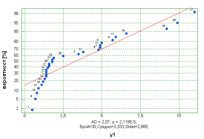 На фигурата отдолу е показана нормалната графика за размера на частиците. Тазуи случайна величина не е нормално разпределена, защото точките не са на една права линия, AD е голяма и p е много малка (p<< 0.1).