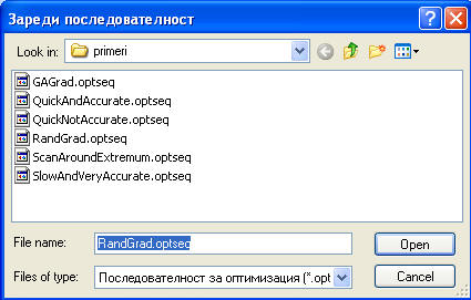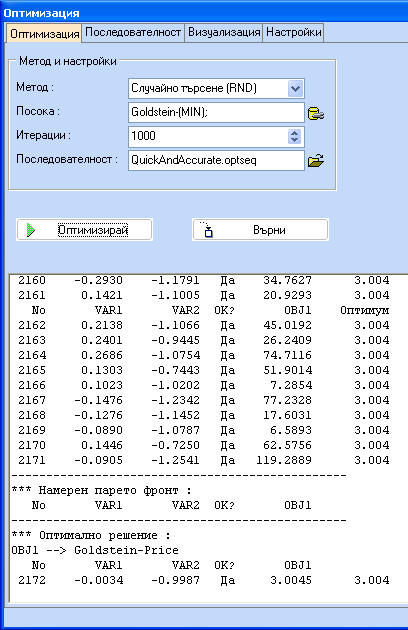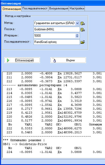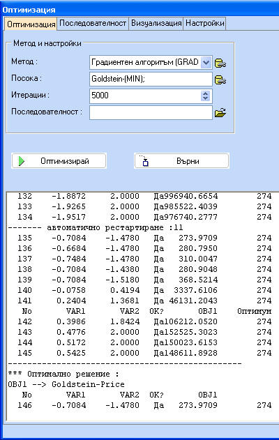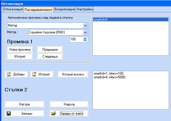Вижда се, че комбинацията от двата метода дава резултат, който е много по-близко да истинския оптимум. Бутонът "Последователност" на фигурата по-долу дава възможност за създаване или редактиране на последователности. Всяка нова СТЪПКА копира настройките на предишната СТЪПКА и прилага зададените промени. Например в последователността RandGrad.optseq sequence е зададено, че първата стъпка се състои от случайно търсене (OMETHD=1) за 100 итерации и е последвана от Градиентен метод (OMETHD = 4) за максимум 5000 итерации.