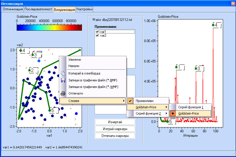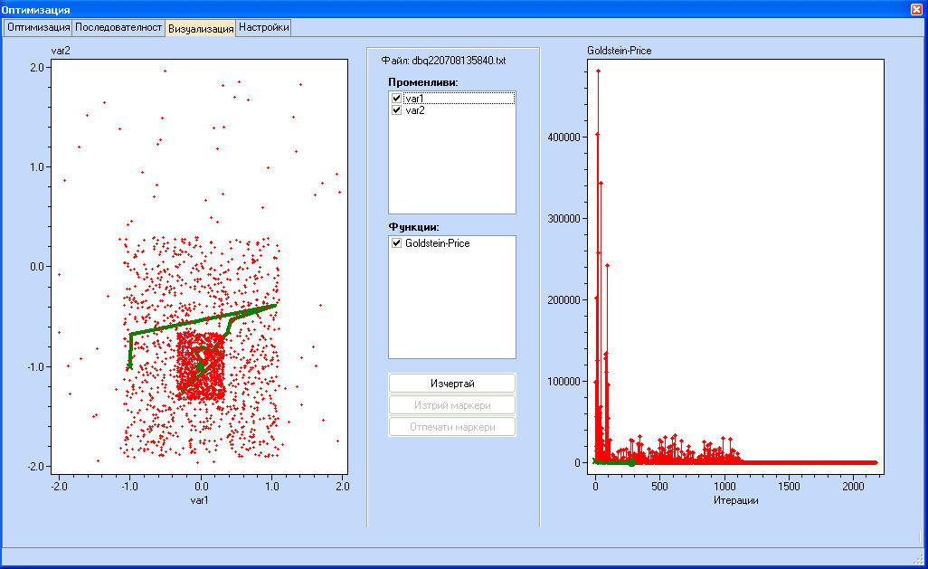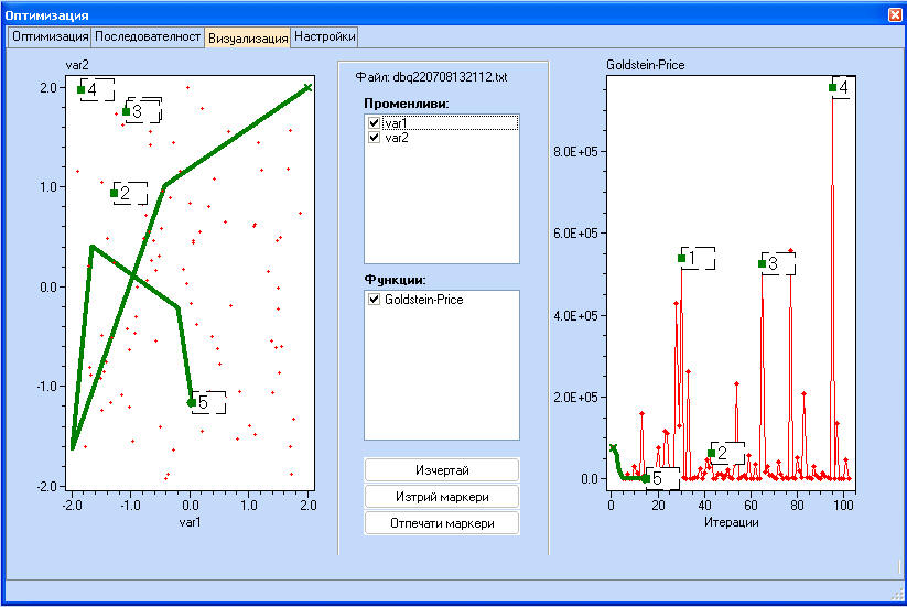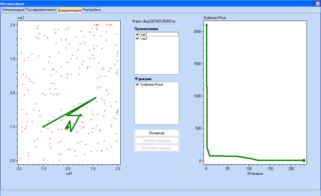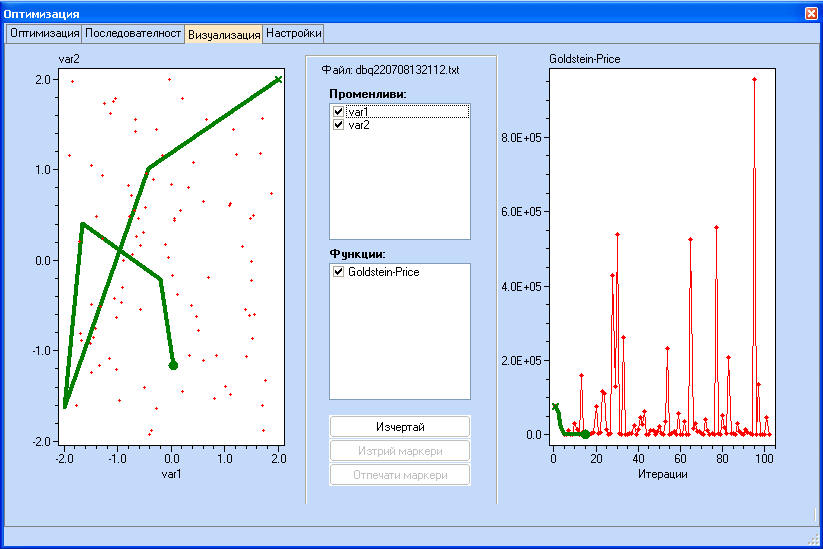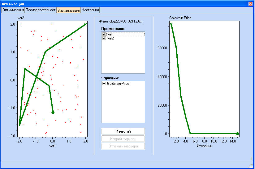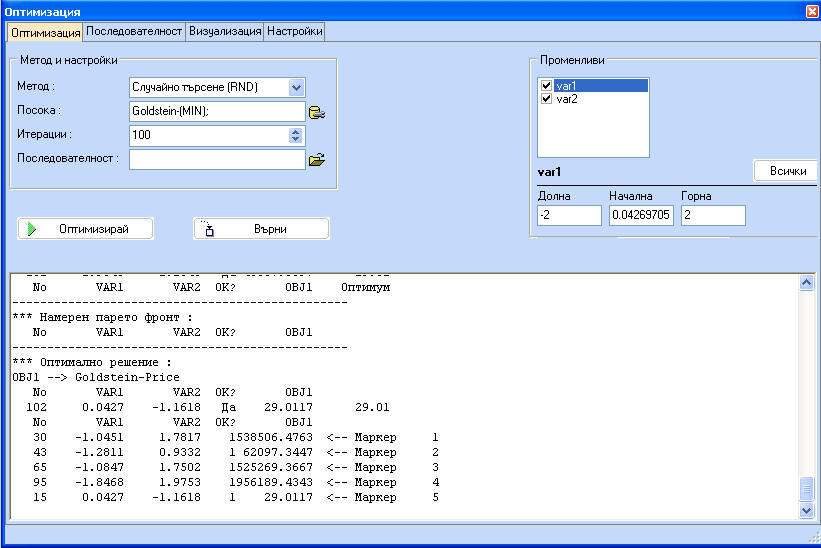 Стойностите на функцията, отбелязана с маркери се появяват в долната част на екрана с резултатите от оптимизацията.