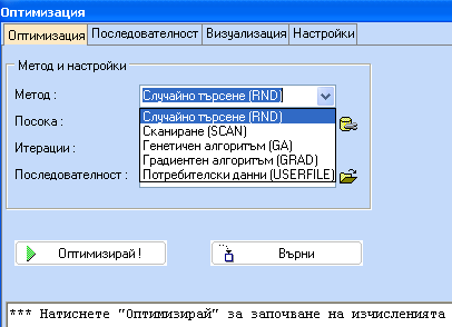 След като извикате програмата за Оптимизация, най напред трябва да изберете метод за оптимизация, брой на итерациите и посока на търсенето на оптимума. Някои методи като генетичните алгоритми и градиентните методи имат допълнителни настройки, които са избрани по подразбиране с най-честоизползваните стойности.