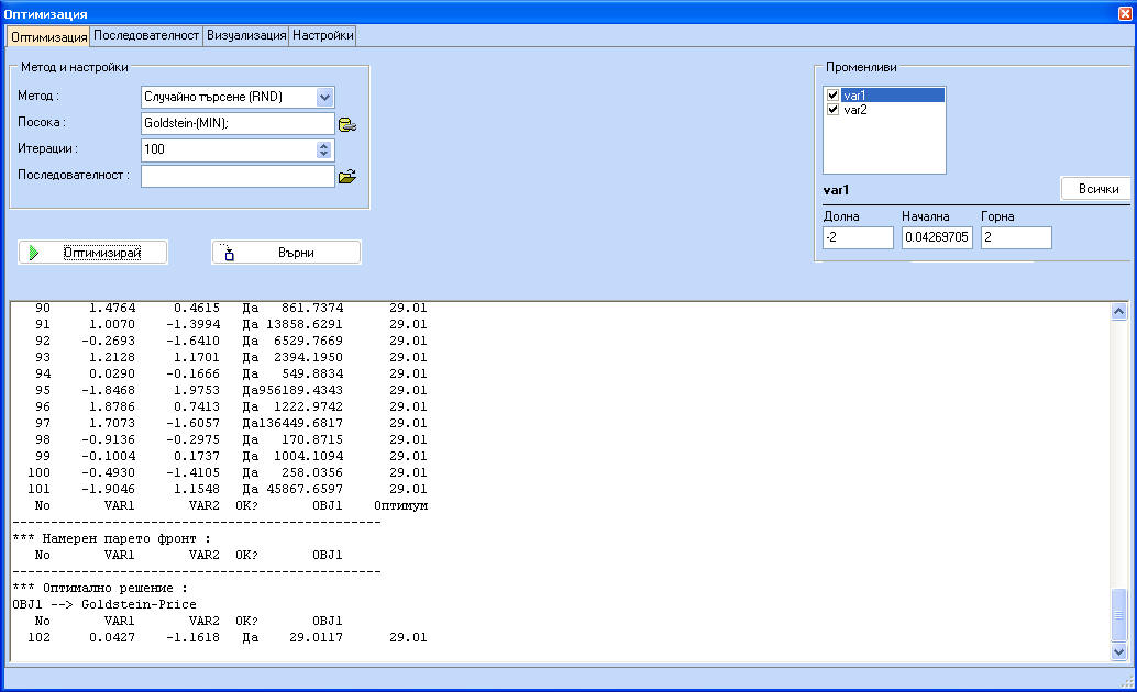 Има няколко предварително програмирани последователности в директорията с примерите. Файлът с последователностите трябва да се трябва да се избере в полето "Последователност". Изберете 'RandGrad.optseq' , която е една последователност от Случайно търсене, следвано от Градиентно търсене. С тази последователност, тръгвайки отново от var1=var2=-1 ще получим следното: