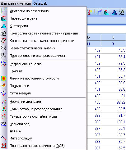 Пример. Разглежда се процес на заваряване. Предполага се, че якостта на заварката зависи от изменението на напрежението за период от 24 часа. Напрежението се измерва на всеки 5 минути и данните се записват в реда на измерването. За всяко напрежение U се измерва якостта на разкъсване на заварката Y. Записани са 122 данни (файл 13-Other methods.qsl). Част от тях са показани по-долу.