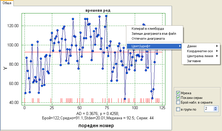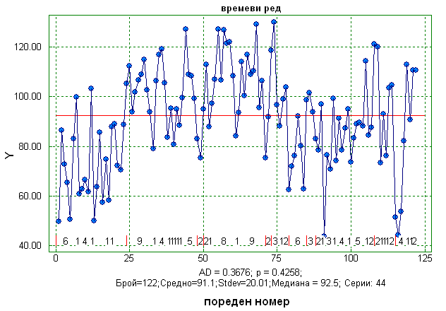 Наблюденията могат да бъдат подредени по групи с различен брой наблюдения. Когато опцията "Брой набл. в сериите" не е маркирана, наблюденията няма да бъдат групирани. На фигурата по-горе е дадена друга форма на времевия ред за якостта на заварката, където броят на наблюденията не е даден, но сериите са ясно означени.