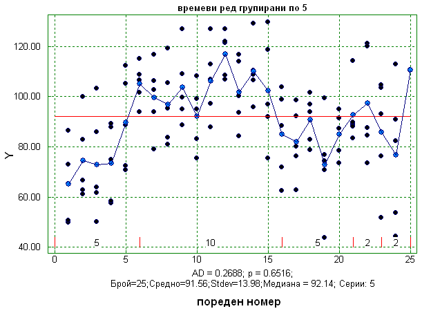 Може да се чертае също времеви ред и с групирани наблюдения. На фигурата по-долу е даден същият времеви ред за якостта на заварката, но данните са групирани в подгрупи от по 5 наблюдения.