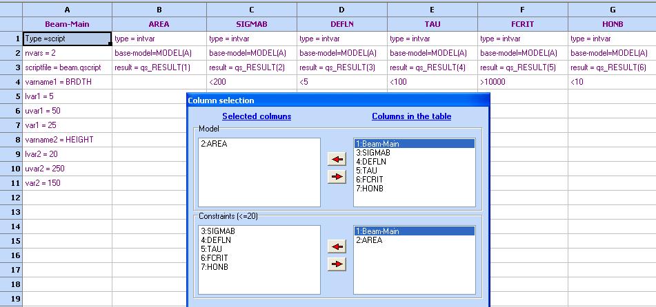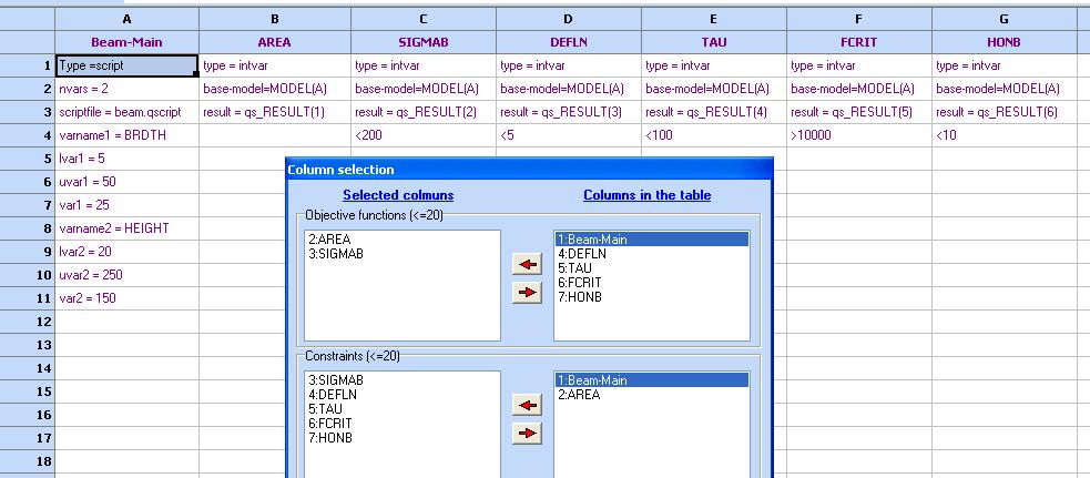 Open file beam\beam-script.qsl. This example can be repeated using beam\beam-exe.qsl and beam\beam-spreadsheet.qsl, that contain alternative definitions for the beam model.