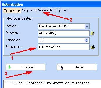 Choose an optimization method to find the minimum of the AREA. We have used a sequence of Genetic algorithm and a gradient search, specified in the Sequence field (GaGrad.optseq).