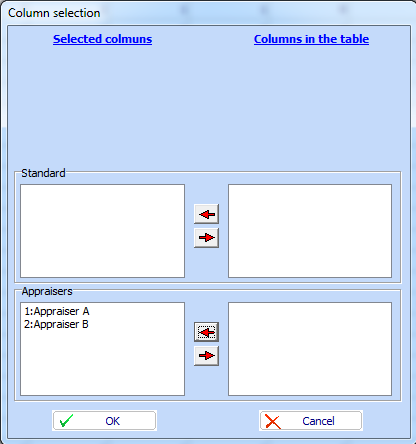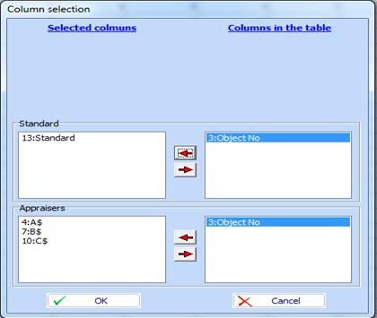 The same data can also be ordered in only one separate column for each appraiser. If there are repeated observations they should be written immediately after the first observation in the same column and it the same order. For the example under consideration there are 3õ50=150 rows. Standard is repeated in the last column as many times as the number of repetitions is. A fragment of such table (15 rows of 150) is given below: