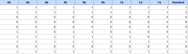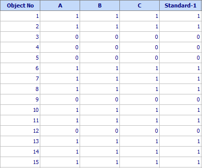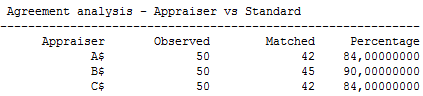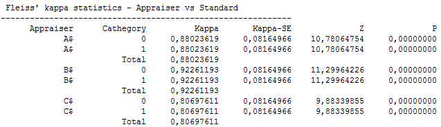 Example 2. (file: Attributes-Go-noGO.qsl). Three appraisers A, B and C have made assessments of 50 parts, each of them was classified in one of two categories: Good (1) or No good (0). Each appraiser classifies each part 3 times, but he does not know that the parts are the same. The true state of these parts is known and it is denoted as “Standard”. A fragment of data is shown below.