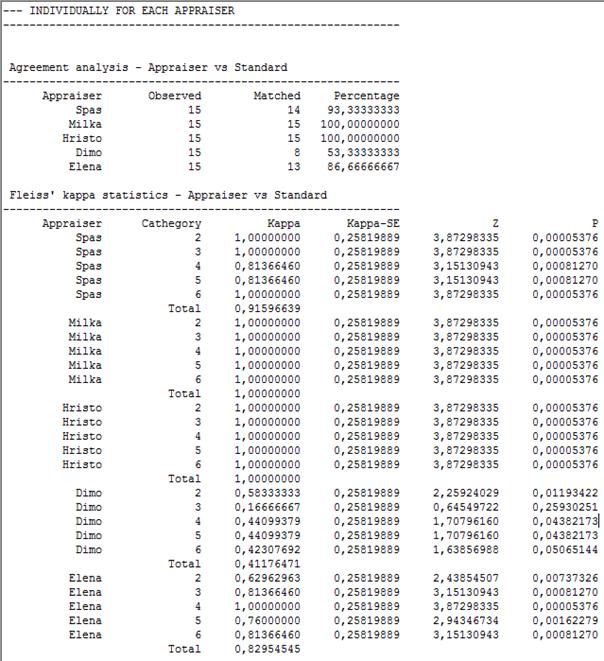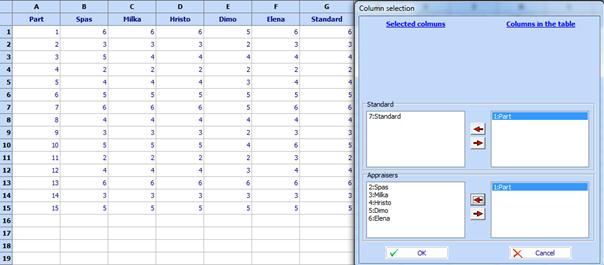 Example. Let 5 experts: Spas, Milka, Hristo, Dimo and Elena visually assess quality of some parts. Suppose we want to see if different appraisers assess the parts in one and the same way. Quality of parts is assessed as follows: