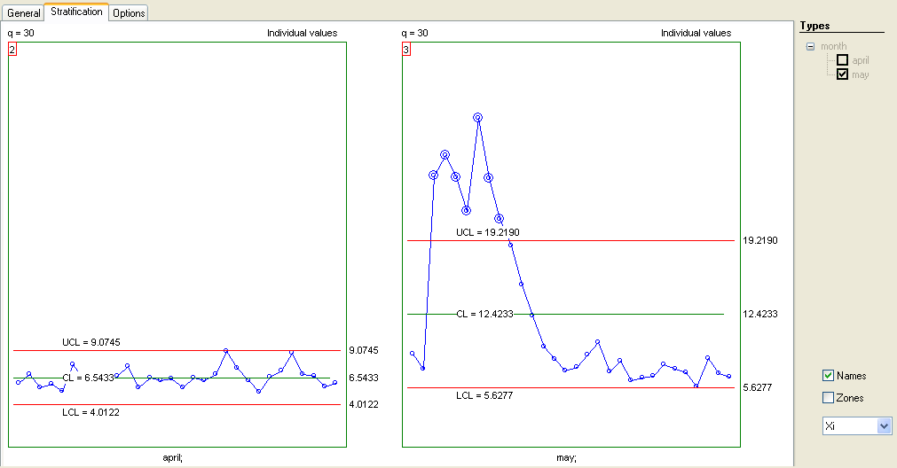 Stratification is also possible, if 'type' columns are added - for example ("worker" and "machine"). The following example shows stratified charts for the biological oxygen demand (BOD) of a river over two months. The data are in columns "month" (type) and "BOD" (data), and we have used the following settings: