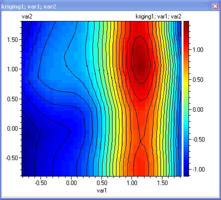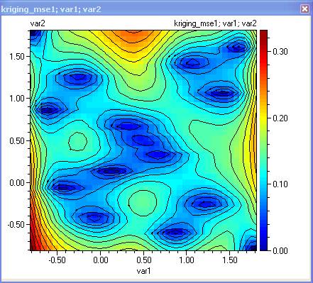 The prediction error – this plot can be used to plan further experiments where the error is greatest. Use CTRL + mouse click to set markers at the locations of maximum error and then use the Edit/Copy markers (variables) to copy the coordinates of the marked points. They can then be pasted to the spreadsheet.