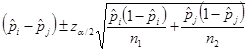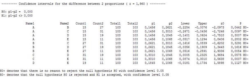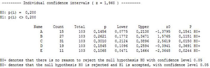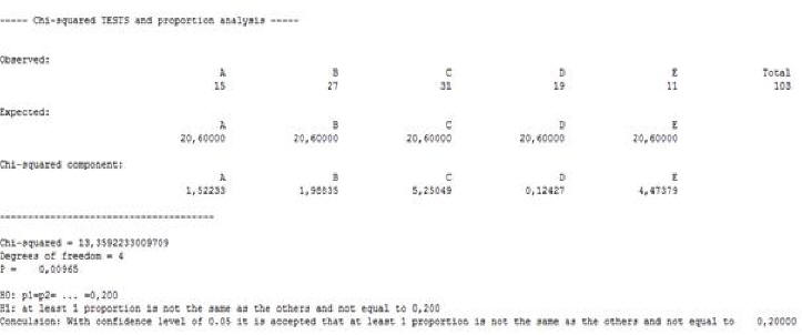As Ð = 0.00965 < 0.05, the null hypothesis for equality of all proportions is rejected. Looking at chi-squared components one can see which proportions differ mostly from value (1/ê) = 0.02. The largest component (5.25049) is for machine C. On this machine are obtained much more defective parts (31) than expected (20.6). The next largest component (4.47379) is for machine E. For this machine the observed number of defective parts (11) is much smaller than expected (20.06).