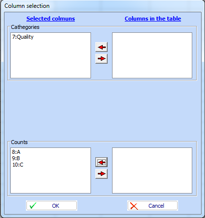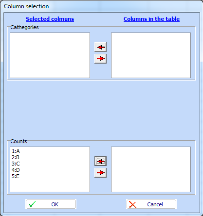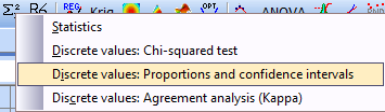 Select “Discrete values: Proportions and confidence intervals”. A menu for column selection will appear. Shift the names of all columns containing information for the problem under consideration from right to left field (Counts):
