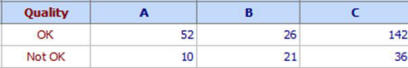 As P < 0.05 we conclude that the factor “Supplier” is significant, i.e. the results depend on the supplier. Chi-squared component can show how big the difference between the results of different suppliers is. The largest component is for supplier B. For this supplier the differences between the expected and the observed values of supplies with quality OK and NOK is largest. Twenty six supplies of quality OK are observed, while the expected supplies of quality OK are 36. Also 21 supplies of quality NOK are observed, while the expected ones are 11.