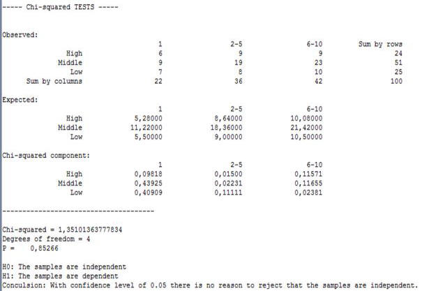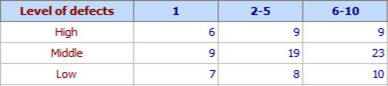 Example 2. One of the criteria for workers’ assessment in a factory is the number of defectives in 1000 produced parts. The work is monotonous and it is expected that after the initial training period the human motivation will go down. Considered are 100 workers divided into 3 categories: Category A – workers having up to 1 year experience, category B – workers with working experience between 2 to 5 years and category C - workers with experience from 6 to 10 years. The level of defects is divided into 3 categories: high, middle and low. We want to understand if the level of defects depends on working experience (file: Contingency.qsl).