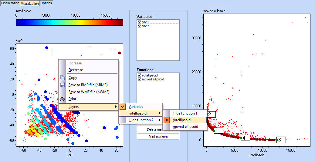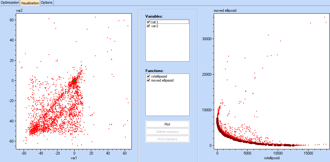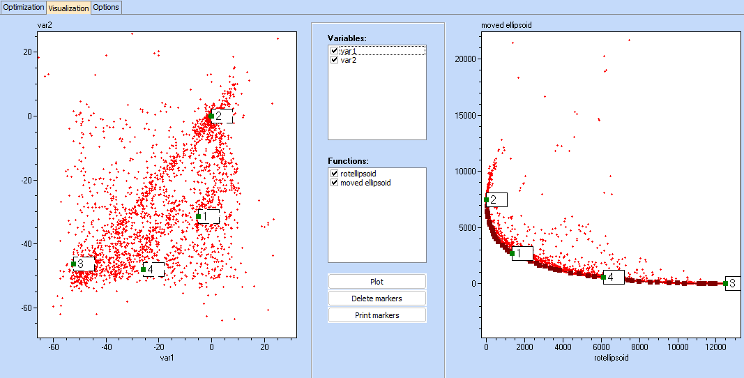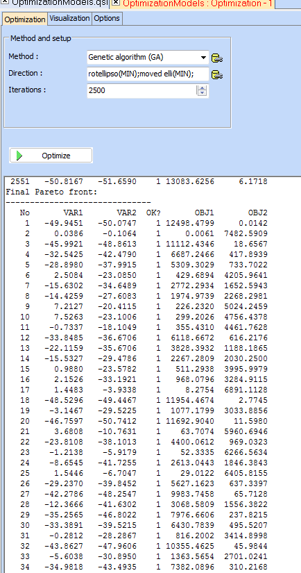Click Optimize and wait until the optimization completes. When it does, the result is the so called 'Pareto front', which contains the non-dominated solutions - these are solutions that at least in one objective are better than the rest.